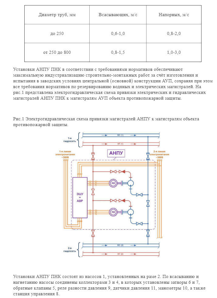 Установки АНПУ ПНК в соответствии с требованиями нормативов обеспечивают максимальную индустриализацию строительно-монтажных работ за счёт изготовления и испытания в заводских условиях центральной (основной) конструкции АУП, сохраняя при этом все требования нормативов по резервированию водяных и электрических магистралей. На рис.1 представлена электрогидравлическая схема привязки электрических и гидравлических магистралей АНПУ ПНК к магистралям АУП объекта противопожарной защиты.