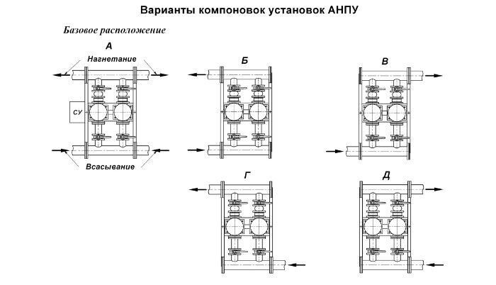 Каждая установка поставляется в смонтированном состоянии, испытанной на стенде, готовой к подключению и эксплуатации, за исключением установок с опциями, предусматривающими дополнительную работу по монтажу на объекте заказчика. Базовое исполнение установок АНПУ ПНК предусматривает минимальную конфигурацию, достаточную для полноценного функционирования. Базовое исполнение может быть дополнено специальными возможностями и их сочетаниями, позволяющими расширить диапазон их использования в различных областях, а по согласованию с заказчиком возможны исполнения установок с функциональными возможностями, не предусмотренными в списке опций. Для того, что бы установки могли сопрягаться с многочисленными вариантами компоновок АУП объектов (см. электрогидравлическую схему на рис.1) на рис.3 представлены варианты расположения водяных магистралей установок, которые подтверждают, что эта задача успешно решается.